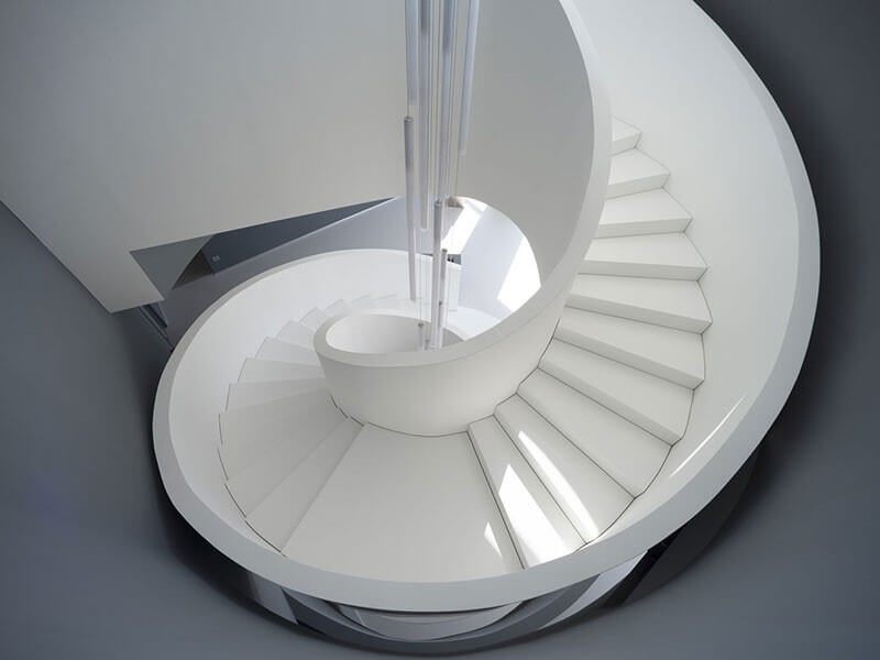 Cầu thang đá nhân tạo được trang trí bằng đường cong uyển chuyển mềm mại, tạo nên một tác phẩm nghệ thuật cầu kỳ tinh xảo, góp phần tạo nên vẻ đẹp hoàn mỹ cho không gian.