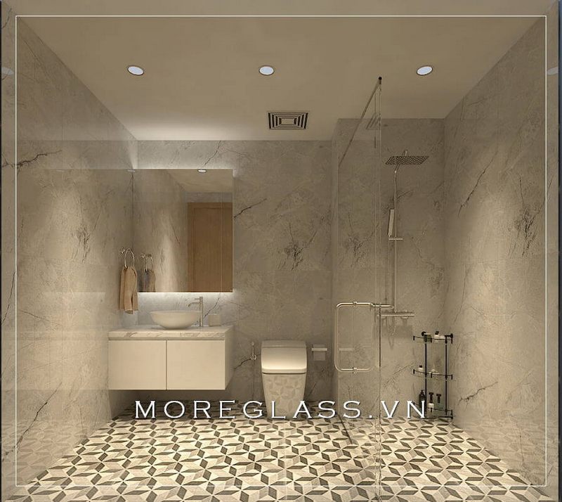 Mẫu đá nhân tạo kem nhạt kết hợp với ánh đèn vàng tạo nên không gian thư giãn tuyệt vời cho phòng tắm cao cấp vân mây.